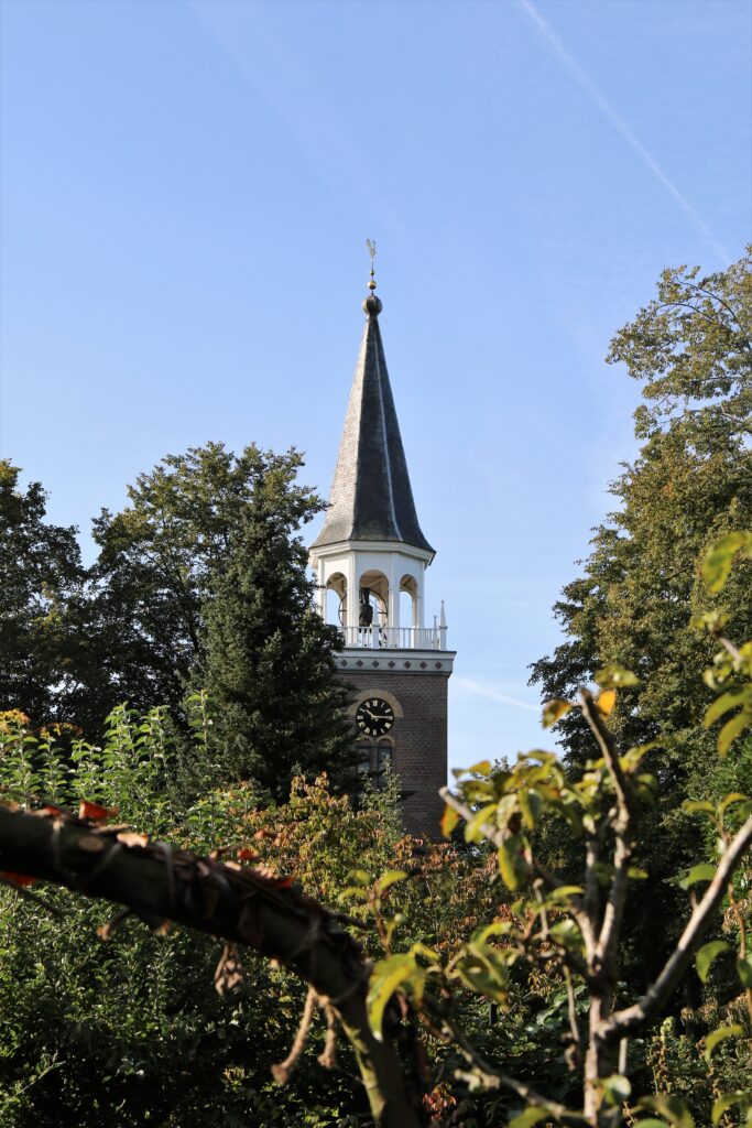 Objets trouvés ligt tegen de wierde van de kerk van Blijham; de toren torent boven de bomen uit en je weet altijd hoe laat het is.