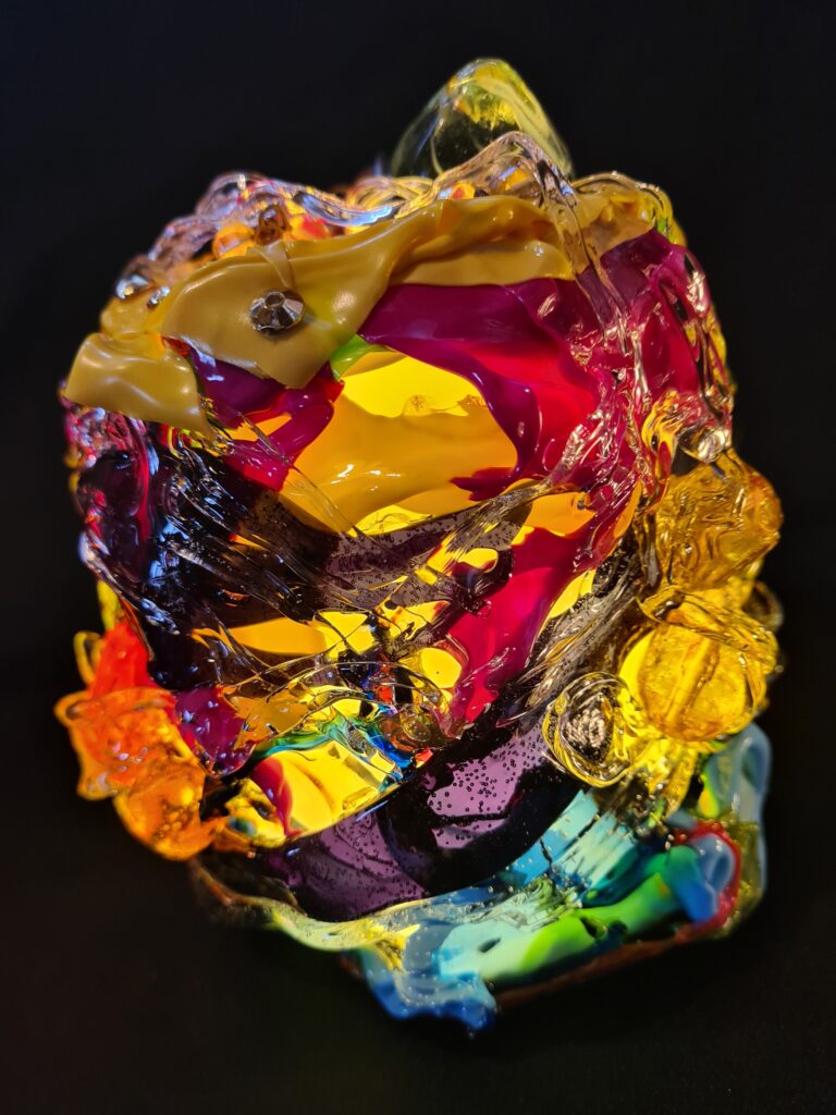 De kunstenares bedient zich van vele technieken voor haar de kunst. Schilderen op het doek, maar ook op lappen stof, zodat ze vormbaar en naaibaar zijn en je er een jas of lijkwade van kunt maken.