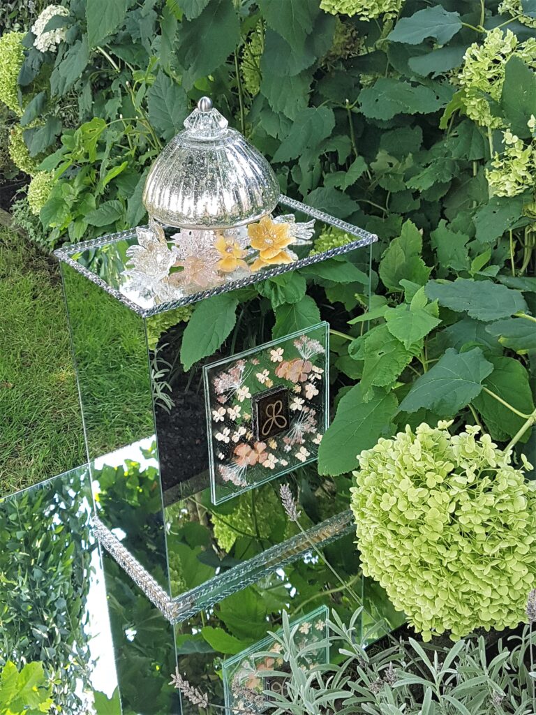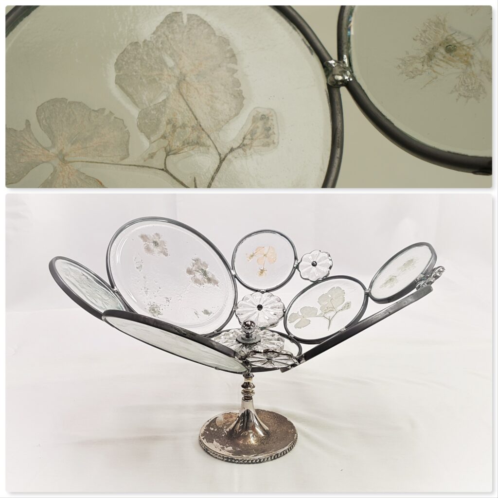 Jeanette is een tuinliefhebster, niet verwonderlijk dat ze graag werkt met echte bloemen in- en op glas. Veel plantaardig materiaal komt uit haar eigen tuin. Daarnaast maakt ze ook gebruik van andere materialen zoals hout en natuursteen. Maar de tuin is ook een inspiratiebron voor het maken van glasbloemen, of het gebruik van glaspoeders waarbij bloemen of blad in glas worden gebrand.